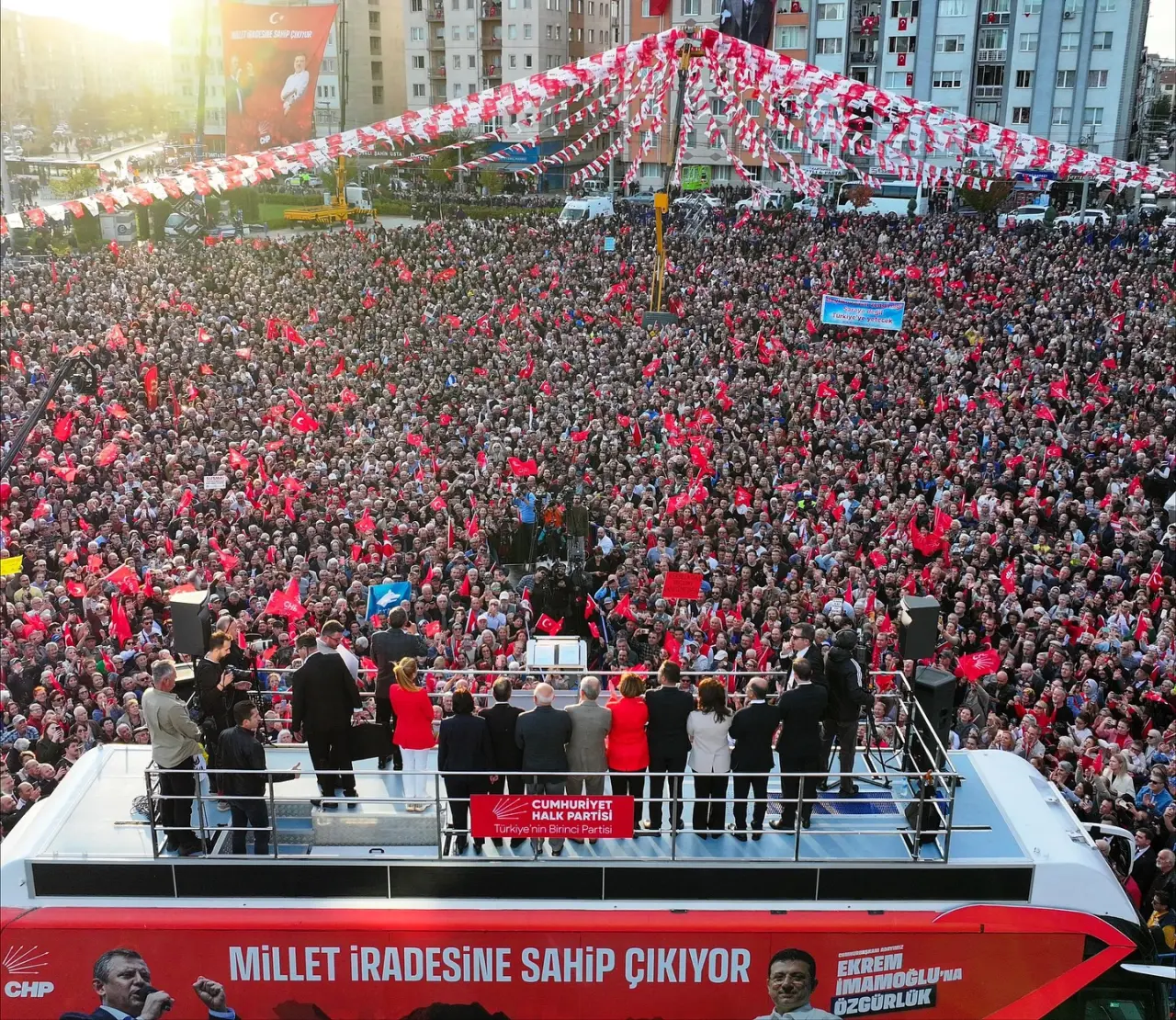Daha sonra CHP Genel Başkanı Özgür Özel, Eskişehirlilere seslendi. Özel, geçmiş dönem Büyükşehir Belediye Başkanı Prof. Dr. Yılmaz Büyükerşen ile birlikte halkı selamladı ve Büyükerşen’e övgüler yağdırdı.